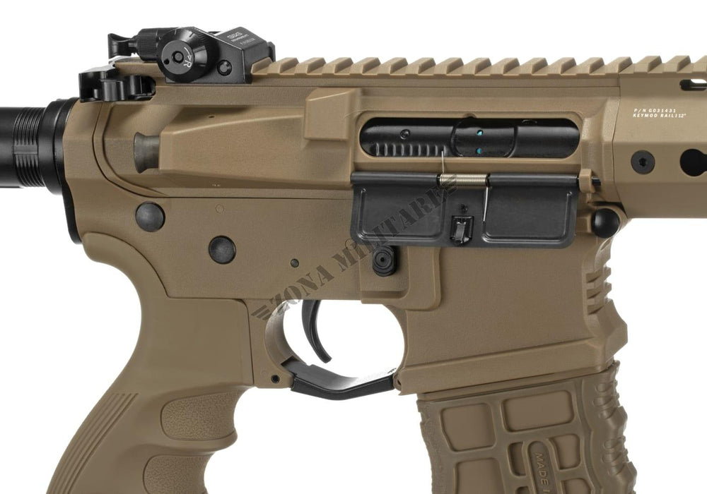 La canna è dotata di una filettatura CCW da 14 mm e può accettare diversi dispositivi di volata, soppressori e Tracer. Il calcio retrattile realizzato in polimero di alta qualità è comodo da usare. È anche facile da maneggiare in spazi ristretti e semplice da riporre. La batteria è posizionata all'interno del tubo tampone. Il cambio V2 dotato di MOSFET è abbinato a un innovativo sistema ETU per un tempo di reazione del grilletto e una durata eccellenti.