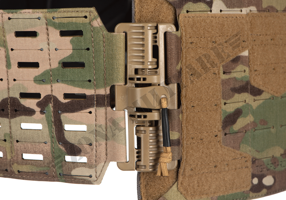 La base è cucita da un laminato Cordura 500D trattato IRR con imbottiture comfort foderate in COOLMAX, fettuccia e fili rinforzati con rete 3D e fibbie ROC. La parte anteriore è dotata di sei file di slot PALS tagliati al laser per un semplice fissaggio di tasche autonome. Il pannello aggiuntivo in velcro e Fastex consentono una rapida installazione di un lembo preconfigurato.