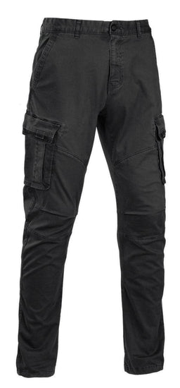 Pantaloni cargo con 2 tasche frontali con bordi rinforzati, 2 ampie tasche laterali e 2 tasche posteriori con chiusura a bottoni.