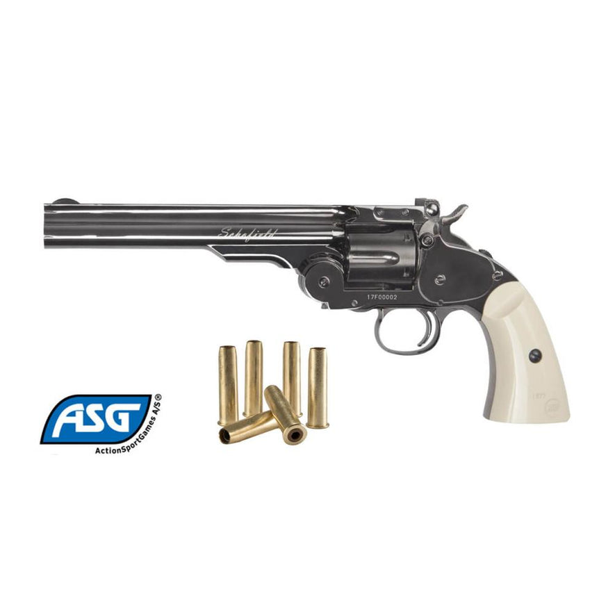Revolver Schofield inox brunito Cal.4.5 Pot.<7.5 Joule ASG bb steel Revolver robusto e invecchiato con guanciole in finto avorio. Assicurati un arma storica, lo Schofield a CO2 è una replica...