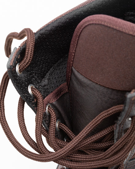 Tomaia in pelle idrorepellente: Pelle marrone scuro di alta qualità, resistente all’acqua e all’usura.