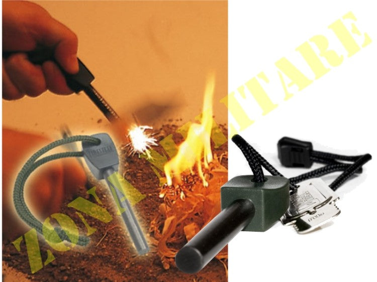 Barretta di magnesio modello Acciarino Svedese, completo di bacchetta e linguetta per lo sfregamento zigrinata. I due accessori sono uniti tramite un laccetto in nylon. Colorazione nera.