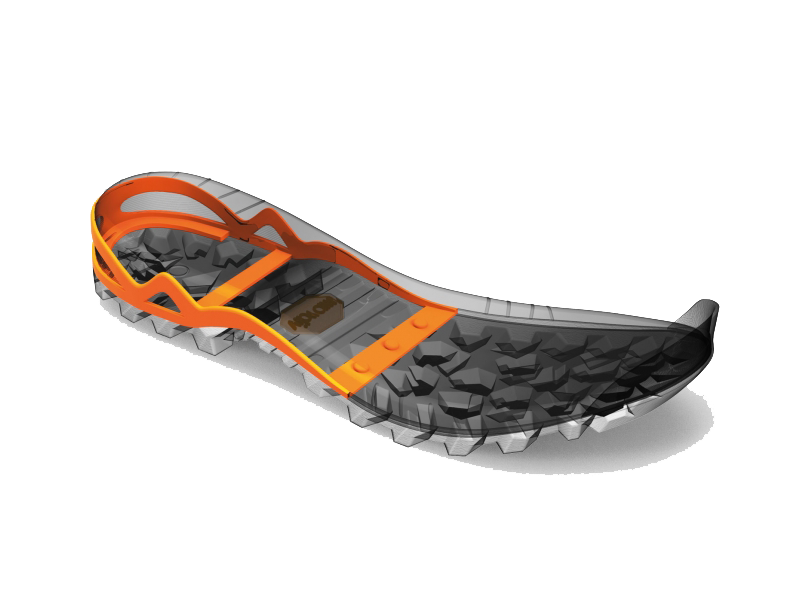 Sagomata sull'anatomia del piede. Bilanciere esagonale per la giusta stabilità torsionale. Venatura strutturale nell'arco plantare. La forma del tallone non permette al piede di scivolare nelle camminate in discesa.