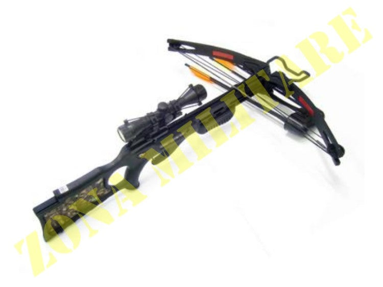 Disponibile in colorazione nera o camouflage, ottima per caccia. Include grasso per manutenzione, 4 frecce, porta frecce, cinghia porta balestra e ottiva con ingrandimento 4x32.