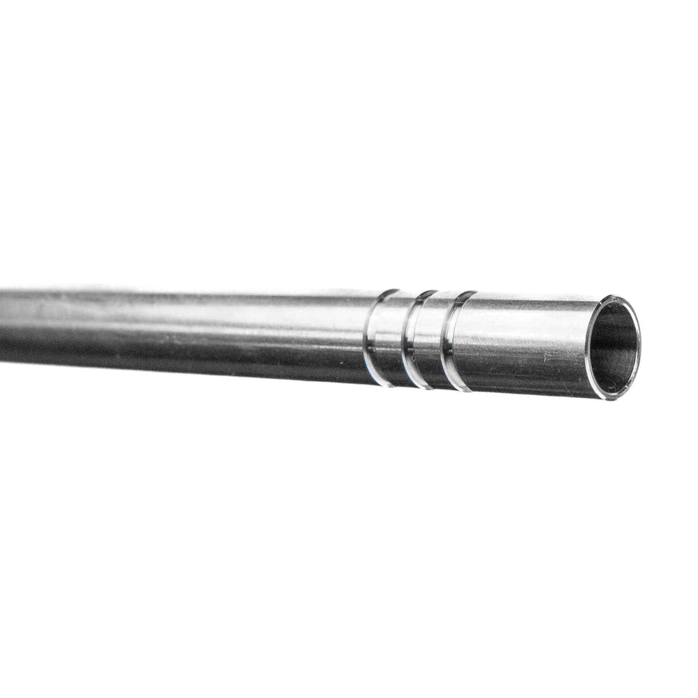 Canna interna in acciaio inossidabile con concentricità garantita e finitura superficiale a specchio. Taglio AEG HopUp nella parte anteriore con compatibilità con qualsiasi unità HopUp standard in stile rotativo V2. La parte posteriore della canna presenta tagli per stabilizzare gli O-Ring e un'uscita della canna coronata per un rilascio di gas uniforme.