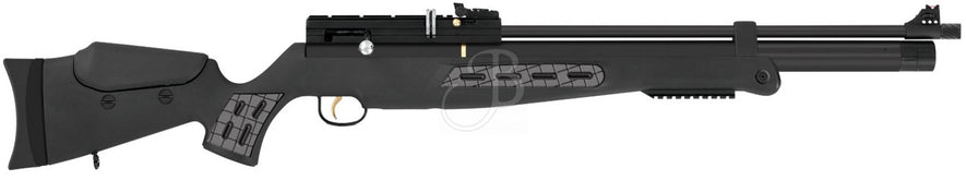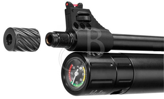 Carabina PCP con caricamento manuale e azione otturatore laterale (SB). Canna rigata di precisione, filettata in volata con passo UNF da ½" e dotato di copri filetto. Calcio sintetico dal design ambidestro ed ergonomico con foro per il pollice. Fessura porta caricatore di ricambio nel calcio per 2 caricatori di riserva. 3 guide picatinny sotto e ai lati della calciatura. Intarsi in morbida gomma sulla calciatura per un miglior controllo e sensibilità. Zigrinatura sull'impugnatura. Calciatura regolabile in altezza. Calciolo in gomma regolabile per lunghezza di tiro, elevazione e angolo di adattamento. Caricatore rotativo staccabile da 10 colpi. Serbatoio dell'aria in alluminio rimovibile (255 cc). Sono disponibili bombole di ricambio. Manometro incorporato sulla bombola dell'aria per monitorare la pressione della bombola. Include ugello a riempimento rapido e tappo di scarico del cilindro pneumatico. Reciver con scanalatura a coda di rondine per supporti per cannocchiale da 11 mm e 22 mm. Finitura generale brunita, ricevitore anodizzato nero. Sicura manuale. Meccanismo “anti-doppio caricamento pellet” che impedisce il caricamento di più di un pellet. Sistema antidetonante brevettato per prevenire lo spreco di gas quando il fucile viene urtato o rimbalzato. Organi di mira regolabili con fibra ottica Truglo. Gruppo scatto match completamente regolabile a 2 stadi per la corsa del grilletto e il carico del grilletto. Grilletto in metallo placcato oro e protezione del grilletto in metallo. Fornito con custodia rigida con tracolla, bipiede, torcia e cannocchiale Optima 3-12x44AOE.