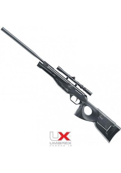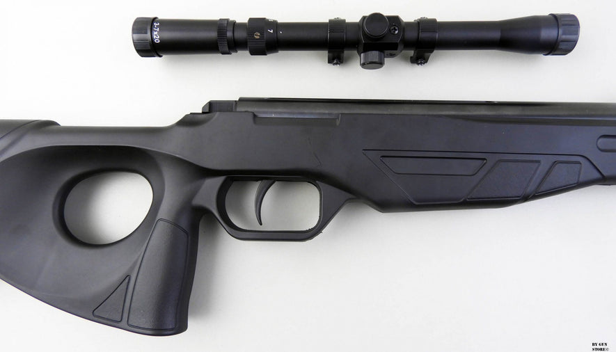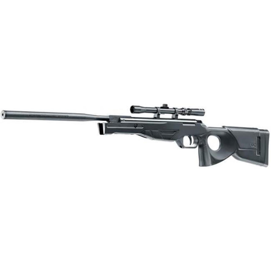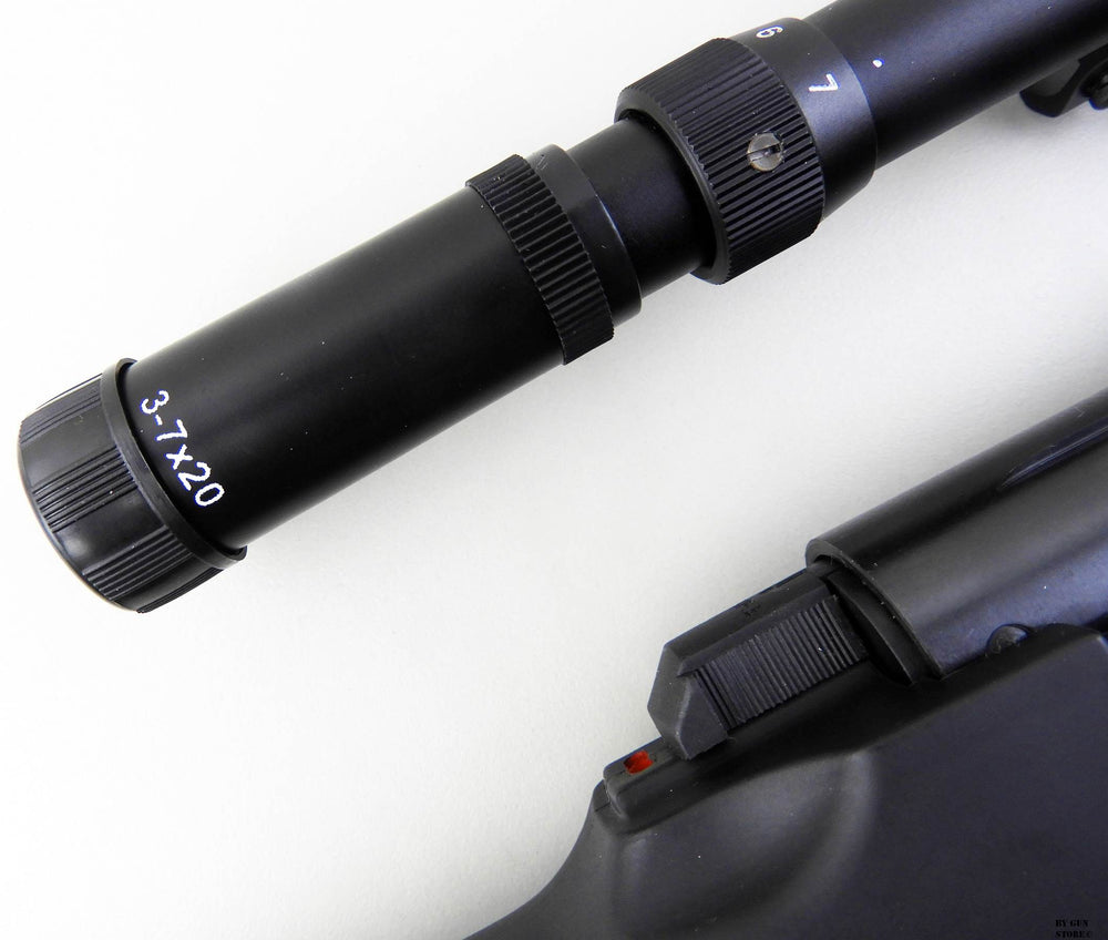 Una carabina ad aria compressa con sistema a pistone a molla, in un calcio polimerico come un fucile da cecchino. Con ottica omaggio 3-7 x 20