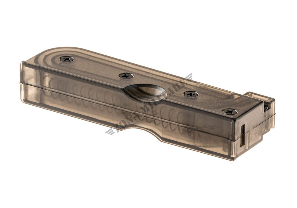 Il caricatore è realizzato in polimero resistente e progettato per un'alimentazione senza interruzioni nelle piattaforme compatibili con il VSR-10. Grazie alla configurazione bifilare interna, 50 pallini sono posizionati in modo efficiente senza compromettere l'affidabilità. La struttura solida e la precisione di inserimento garantiscono un inserimento stabile nell'alloggiamento del caricatore, mentre il design compatto mantiene il tipico stile a basso profilo delle armi da cecchino. Il caricamento è semplice con uno speedloader e le finestre laterali trasparenti consentono di visualizzare facilmente il numero di pallini rimanenti.