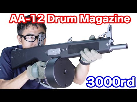 Tokyo Marui 3000 round electric drum magazine for Tokyo Marui AA12 AES system, the front bottom will wind the spring and with just a few winding will be able to run the whole magazine, takes 4x AAA batteries to operate.