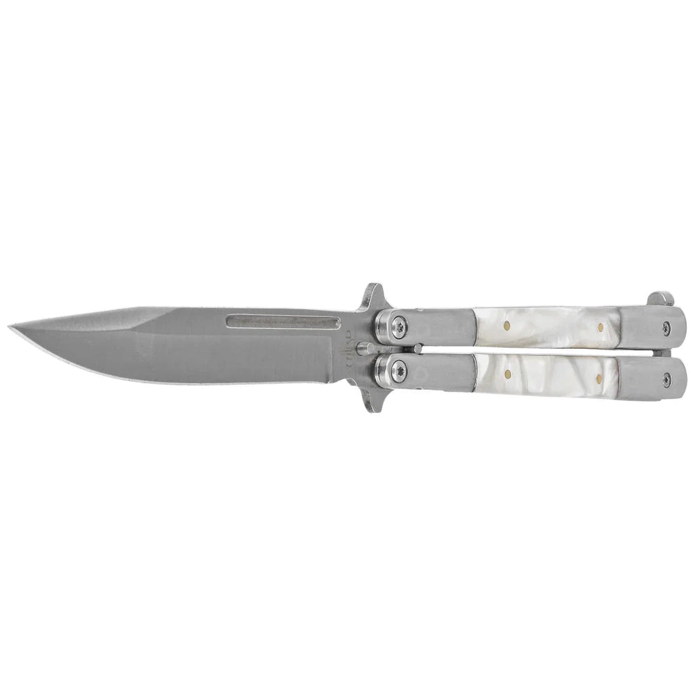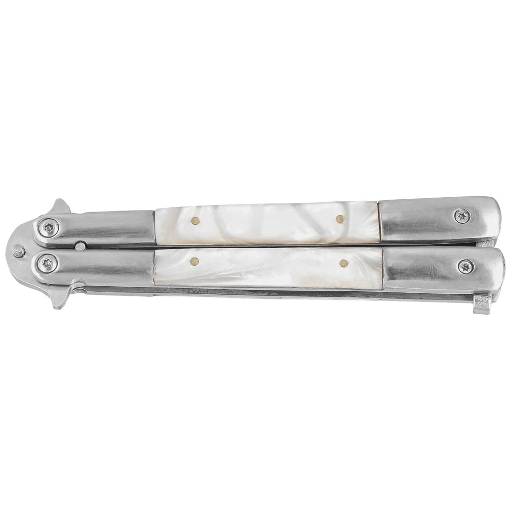 Coltello a farfalla con lama in acciaio inox satinato da 11,5 cm, manico in acciaio inox e finto metacrilato perlato.