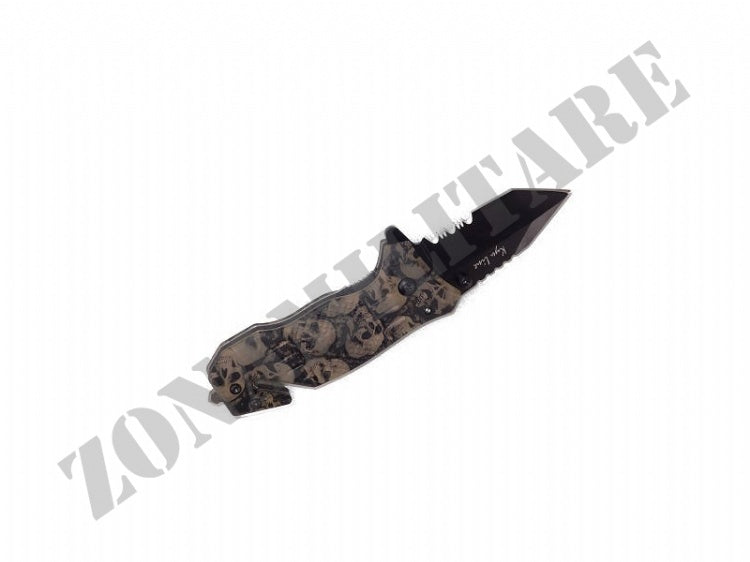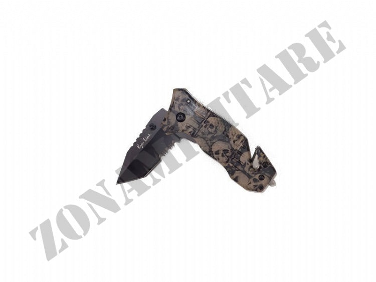Il coltello ha un manico con sopra disegnati teschi e il taglia cinghia posto sull'estremità e frangi cristallo di emergenza.