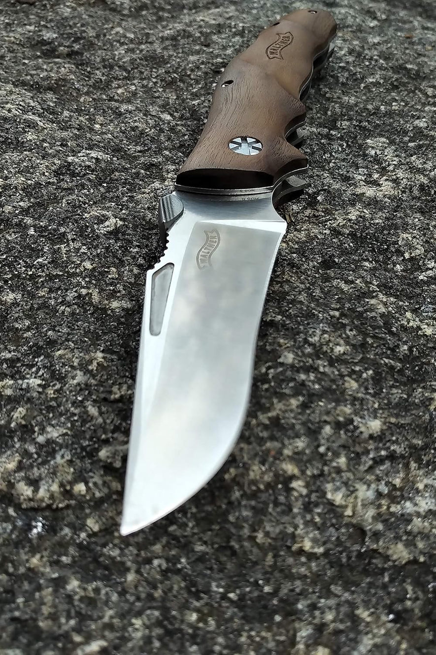 L'Adventure Folder Wood (AFW) rivela i suoi punti di forza già nel nome: un coltello chiudibile con guancette in legno, pensato per gli avventurieri. I materiali sono stati scelti per la massima affidabilità e il design è davvero inconfondibile. La lama è realizzata in acciaio AUS8 ad alto tenore di carbonio, che offre un'elevata tenuta del filo ma è facile da affilare, mentre la forma a punta di lancia conferisce maggiore resistenza. Un pratico perno per il pollice sul dorso facilita l'apertura del coltello e consente al pollice di esercitare maggiore forza durante il taglio. La finitura satinata si armonizza bene con l'impugnatura in noce opaco, che non solo ha un aspetto gradevole, ma ha anche un design ergonomico con un'eccellente presa grazie agli incavi ben posizionati per le dita. Con un peso di poco superiore ai 200 g, questo coltello si impugna bene. Viene fornita anche un fodero in pelle per riporre e trasportare l'AFW con stile.