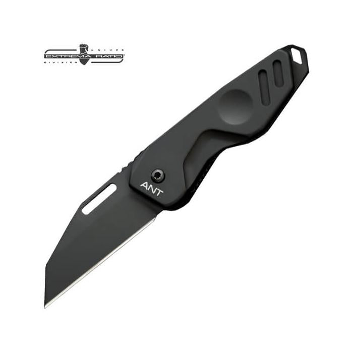 Ant è il più compatto dei coltelli chiudibili Extrema Ratio. Nonostante le sue dimensioni ridotte, questo modello è dotato di una struttura estremamente robusta, resistente ed affidabile. L’impugnatura è composta da due elementi diversi: la guancetta realizzata in alluminio anticorodal anodizzato ed il telaio in acciaio temprato che assolve anche alla funzione di blocco della lama (Frame Lock System). Questo meccanismo prevede che una parte del telaio sia piegato verso l’interno andando a fissare saldamente la lama in posizione aperta, aumentando la sicurezza dell’operatore durante l’uso del coltello. Sul codolo è presente un’asola per l’inserimento di un cordino, sul lato destro della manicatura si trova una clip in acciaio che consente il porto occulto nella tasca. Ant è disponibile in 4 versioni con due diverse tipologie d’acciaio entrambe fornite da Böhler, azienda austriaca con la quale Extrema Ratio collabora da più di 20 anni utilizzando i suoi colladauti materiali per la produzione delle proprie lame. Le versioni Ant Black ed Ant Black Stone Washed utilizzano il Böhler N690, indurito a 58 HRC per il miglior equilibrio tra tenuta del filo e robustezza, tipologia di acciaio utilizzato da Extrema Ratio per la maggior parte dei propri coltelli. Per le versioni Rescue Red Stone Washed e Black Stone Washed M390 Extrema Ratio utilizza l’acciaio Böhler M390 trattato termicamente a 61 HRC che, grazie ad un processo di produzione metallurgico a polvere, garantisce nel tempo efficacia di taglio, resistenza all’usura e all’ossidazione. La lama è di forma sheep foot ed è dotata di una piccola asola sulla parte superiore per agevolare l’apertura. La sua particolare struttura, grazie al bordo dritto, permette all’utilizzatore di appoggiare comodamente le dita sul dorso del coltello ed utilizzarlo con facilità. Ant Rescue, a differenza delle altre 3 versioni, ha una guancetta in colorazione rossa che permette all’operatore di ritrovare con più facilità il coltello in caso di caduta. Questa versione è dotata di una specifica dentatura che permette di recidere cordame e persino materiali aramidici ad alta tenacità. Questo modello inoltre è dotato di codolo rastremato che ha la funzione di cacciavite di emergenza. Ant Rescue è stato sviluppato secondo le esigenze espresse dalla “Scuola Truppe Alpine dell’Esercito Italiano”.