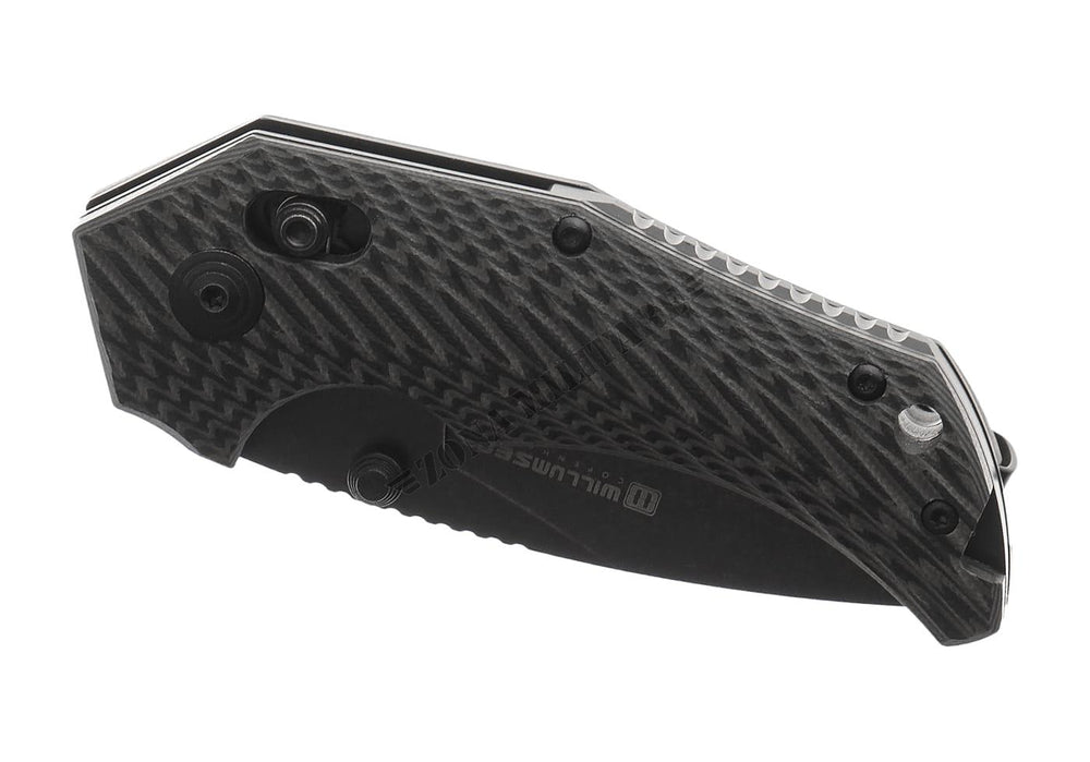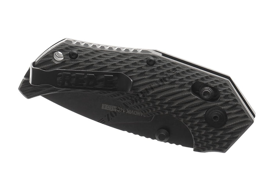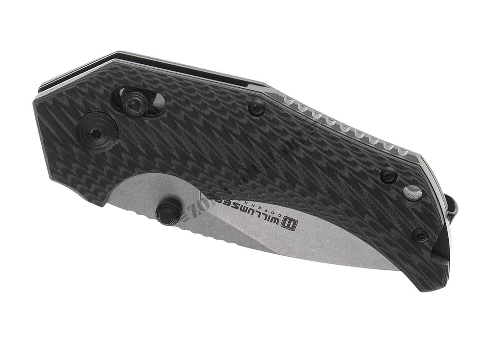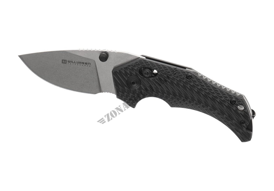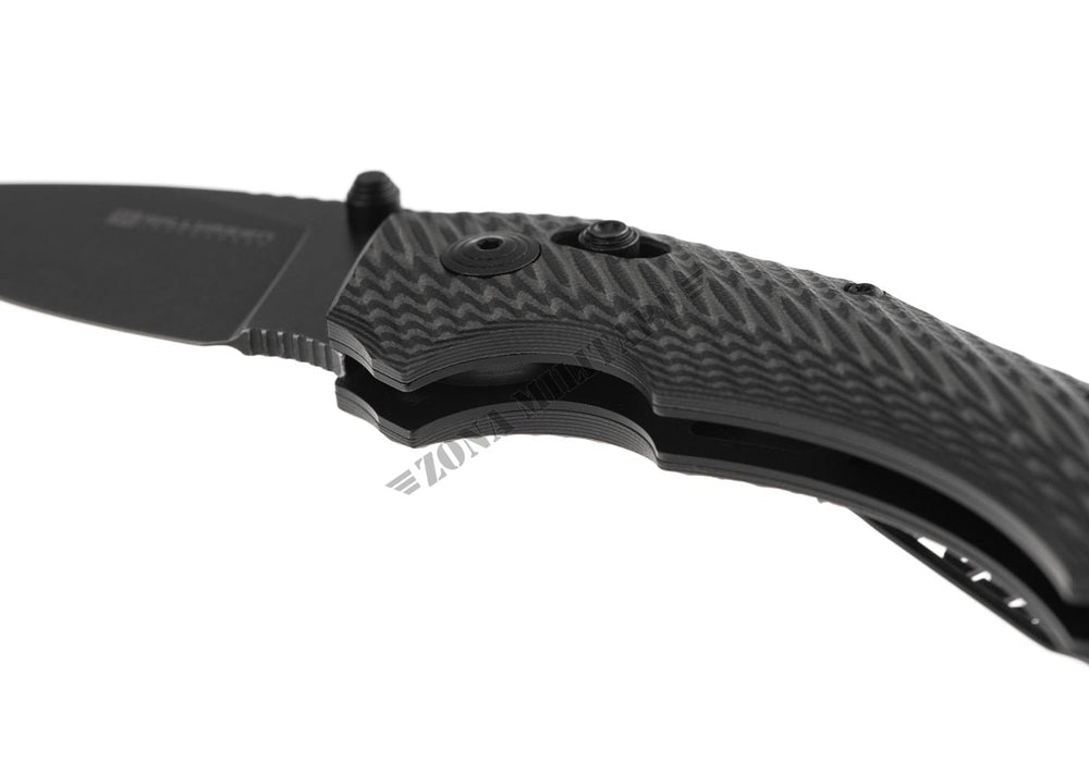 La lama è realizzata in acciaio Sandvik 14C spesso 3,5 mm con finitura stonewash e dotata di un affidabile perno per il pollice per un rapido utilizzo.
