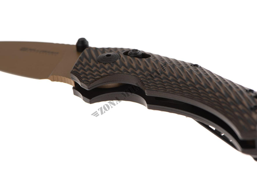 L'impugnatura è realizzata in laminato G10 bicolore e montata su un telaio in acciaio con un meccanismo Axis Lock e un foro per cordino. La clip da tasca rimovibile è disponibile sia per utenti destri che mancini.
