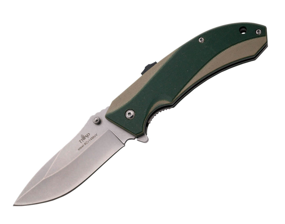 Coltello ad apertura assistita con linerlock. Manico in G10 bicolore verde/cammello e lama in acciaio 8Cr14MoV da 9,3 cm affilato su pietra. Fodero e scatola di presentazione di alta qualità.