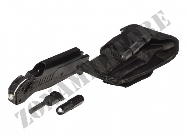 Sicura anti-ritorno nella parte interna del manico, impugnatura in alluminio nero custodia in nylon, chiusura a sgancio rapido, attacco a velcro per cinta, frangivetro, taglia cinghia, acciarino estraibile