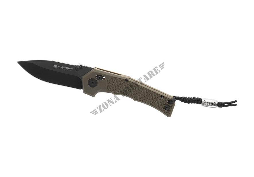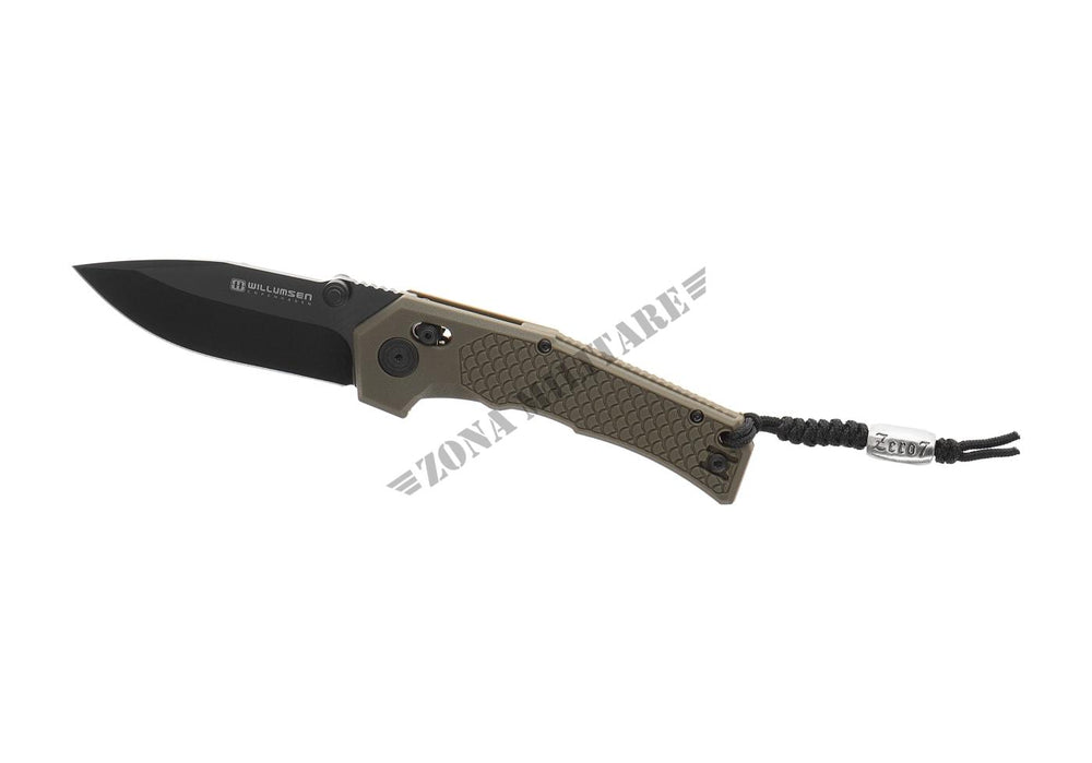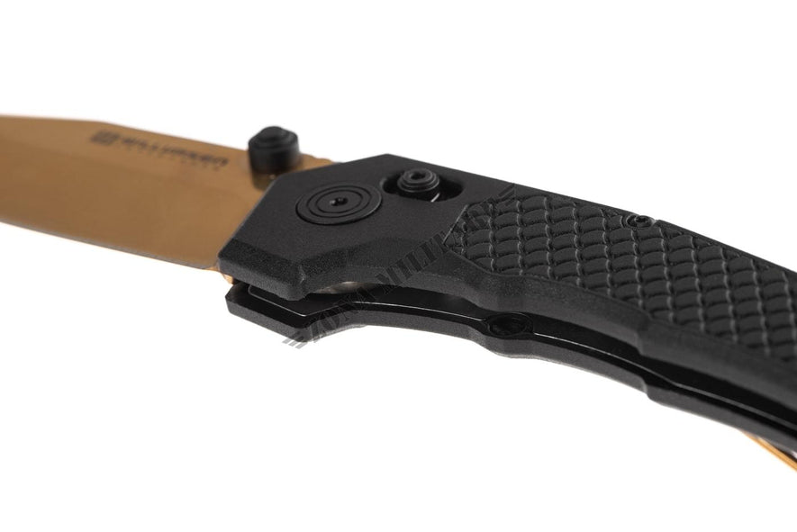 L'impugnatura è realizzata in poliammide GFN ed è montata su un telaio in acciaio con un meccanismo Axis Lock e un foro per cordino. La clip da tasca rimovibile è disponibile sia per utenti destri che mancini.