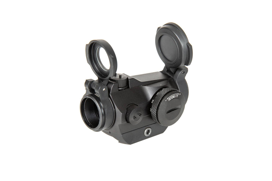 Tubo RedDot con struttura in metallo con montaggio basso. C'è anche una griglia o "killflash" che impedisce i riflessi del sole e protegge dai colpi dei bb. Questo RedDot può essere regolato nei livelli orizzontale e verticale. L'intensità della retroilluminazione del punto può essere modificata di 11 gradi. Le lenti sono protette da tappi incernierati che possono essere rimossi dal collimatore.