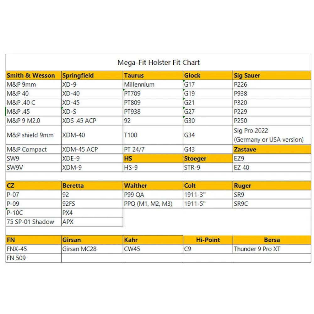La fondina non è compatibile con pistole di grandi dimensioni come le pistole MK23 Socom o Desert Eagle.