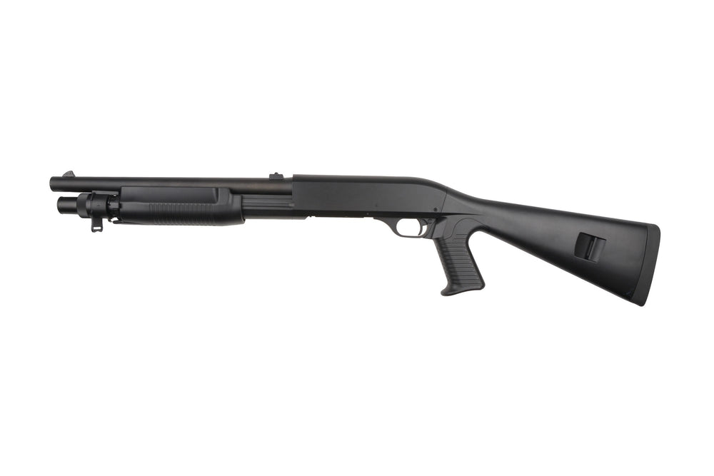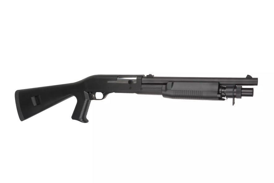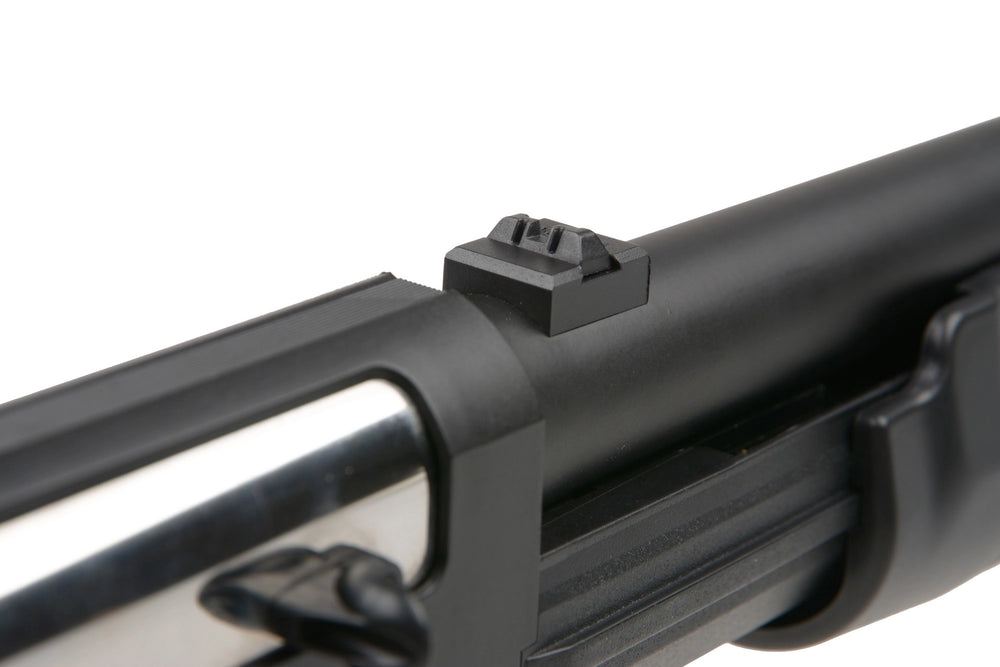 Tutti gli elementi della replica si adattano molto bene insieme. Le parti metalliche includono la canna esterna, lo scivolo anteriore, la piastra della camera, le girelle tattiche dell'imbracatura e la piastra della finestra di espulsione dei proiettili. Gli elementi rimanenti come l'impugnatura a pistola, l'astina, il ricevitore e il calcio sono stati realizzati in polimero resistente .