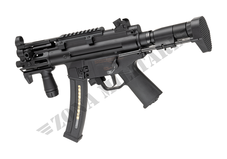 I fucili CYMA Platinum M5 AEG sono fucili personalizzati ispirati alla famosa serie di fucili mitragliatori MP5K. Questo particolare presenta molti stili moderni, a partire dai binari, è un binario in stile M-Lok che lo rende molto più elegante rispetto ai binari RIS e viene fornito con un binario superiore Picatinny, che ti consente di personalizzare la tua pistola con diversi accessori, come luci, laser, ottiche e altro ancora. CYMA ti offre una presa verticale che potrebbe funzionare anche come fermo manuale.