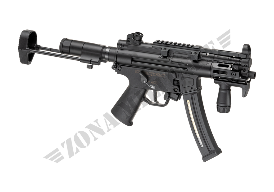 L'M5 presenta anche un calcio retrattile in stile PDW. È probabilmente più comodo rispetto al calcio retrattile in stile MP5 originale, ma non occupa troppo spazio. Anche il rilascio del caricatore su questo SMG è stato ampliato consentendo cambi di caricatore più rapidi e semplici. Parlando di riviste, la rivista su questo SMG è una rivista mid-cap in polimero leggero di alta qualità che è molto ergonomica rispetto alle riviste standard in stile MP5 con corpo in metallo.