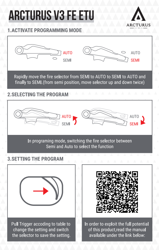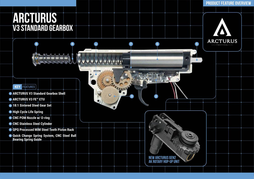 L'AEG ARCTURUS Advanced Tactical MOD1 PDW FE (Feature Enhanced) è l'ultima versione del 2024 con ARCTURUS V3 FE ETU integrato e cambio QD standard V3. L'Advanced Tactical MOD1 PDW FE consente la modalità a 2 raffiche, funzioni ETU programmabili avanzate e corsa del grilletto regolabile tramite fermo del grilletto regolabile.