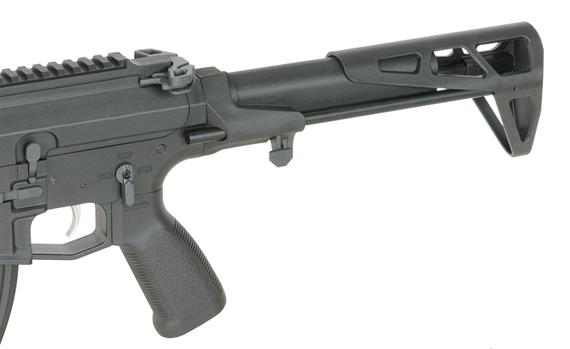 Questo AEG è dotato Inoltre, come standard, queste repliche sono dotate di un sistema di controllo elettronico Falcon con modalità di fuoco programmabile (Double Shot in modalità SEMI o 1-5 Round Burst in modalità AUTO), regolazione della sensibilità del grilletto (3 modalità) e protezione del motore e della batteria.