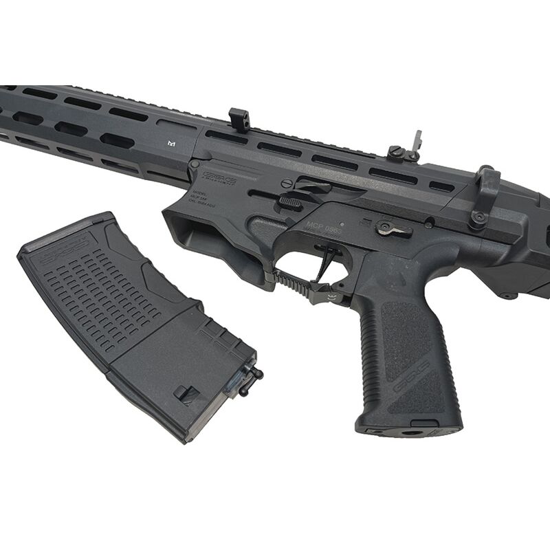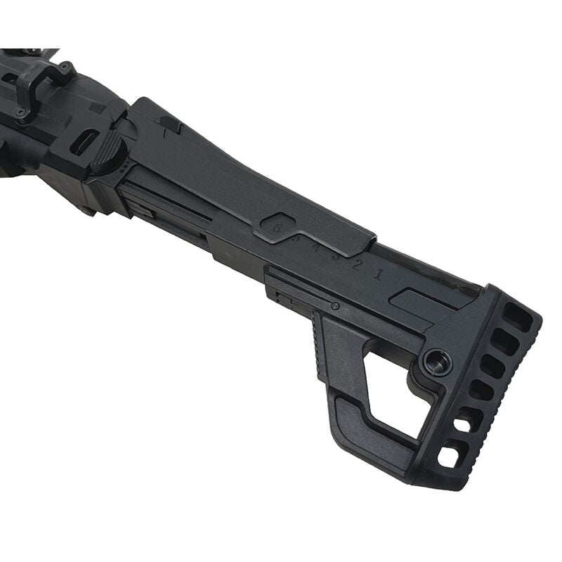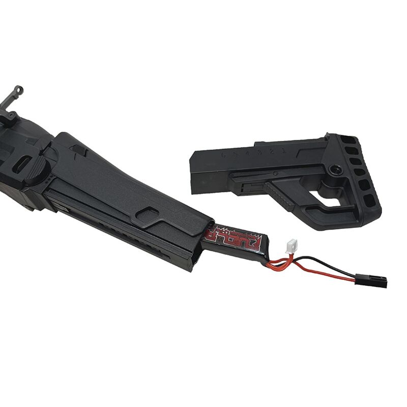 La canna è dotata di una filettatura CCW da 14 mm e può accettare diversi dispositivi di volata, soppressori e Tracer. Il calcio PDW retrattile realizzato in polimero di alta qualità è comodo da usare. È anche facile da maneggiare in spazi ristretti e semplice da riporre. La batteria è posizionata all'interno del tubo tampone.