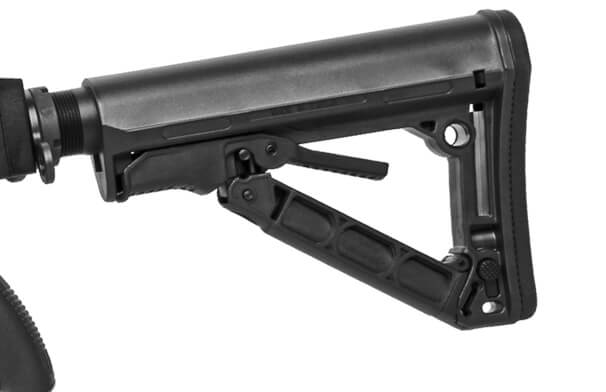 Il calcio in plastica, stile Magpul, ha 6 posizioni di regolazione. La piastra posteriore è gommata. Il vantaggio è anche il meccanismo di piegatura, così puoi accorciare molto la pistola in due secondi.