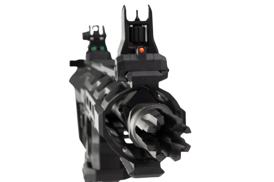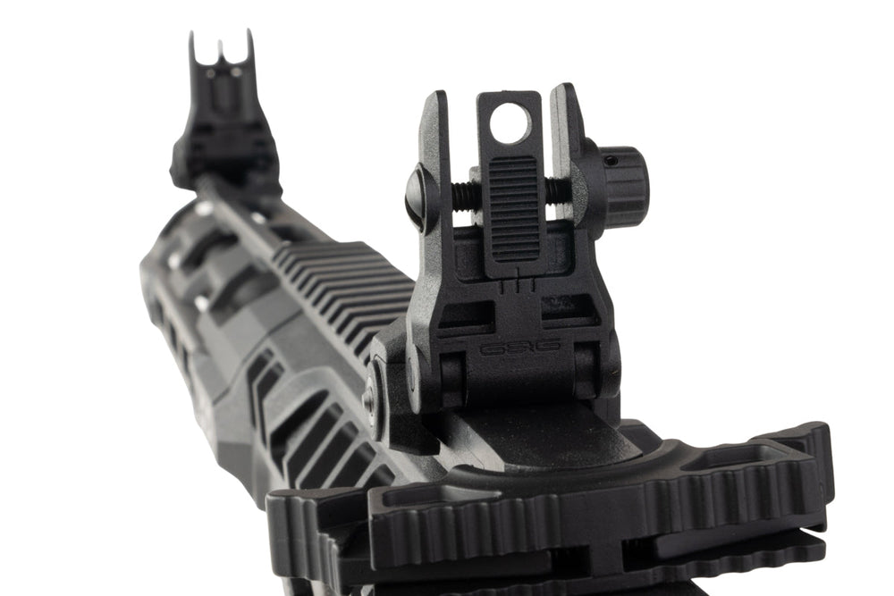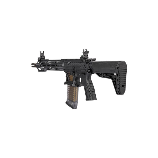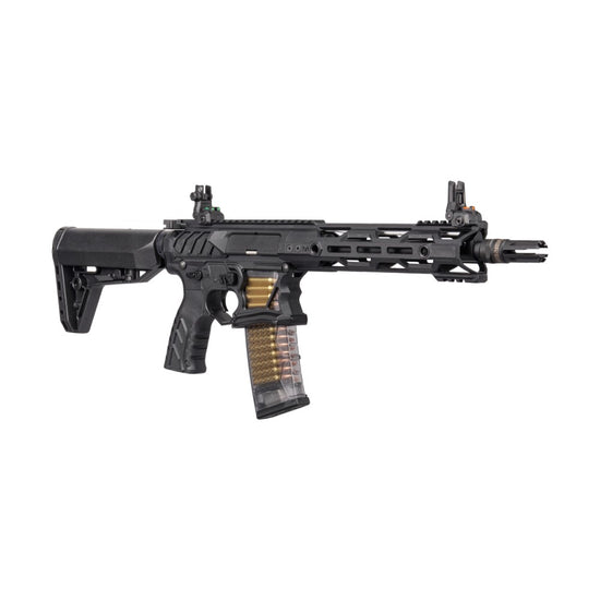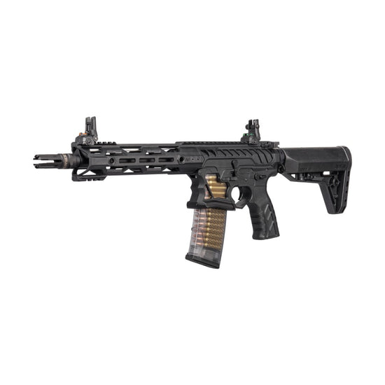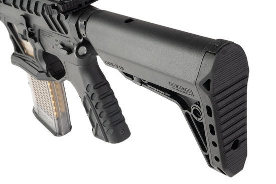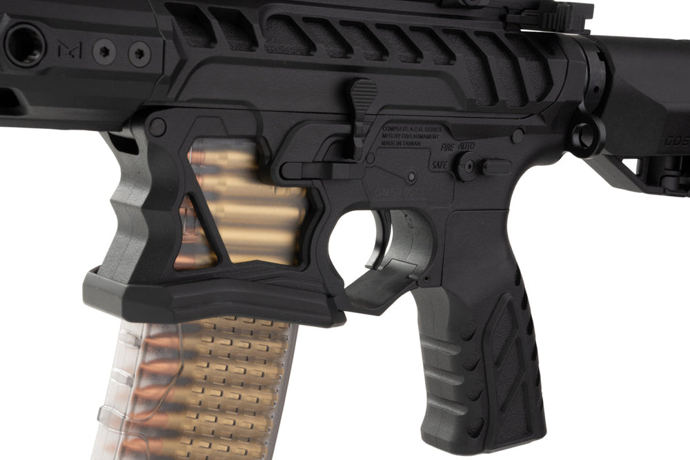 Questo fucile da softair G&G TR16 GMSII MK1 Light Weight Polymer M4 AEG è realizzato principalmente in polimero, riducendone efficacemente il peso senza ridurre la robustezza. È dotato di un paramano in polimero con sistema M-Lok e slitta Picatinny da 20 mm sulla parte anteriore, un ricevitore in polimero e un ricevitore inferiore con una struttura scheletrata per ridurne ulteriormente il peso, consentendo al contempo la visibilità del caricatore dietro il ricevitore, conferendo all'arma da softair un design unico. Include inoltre una canna esterna e un freno di bocca in metallo, un calcio GOS-V15 in polimero con un tubo di calcio a 6 posizioni e un calciolo in gomma, un'impugnatura a pistola in polimero, mirini anteriori e posteriori ribaltabili in fibra ottica a doppio profilo in polimero, un selettore a corsa corta ambidestro in metallo a 90 gradi, sganci del caricatore ambidestri in metallo, una leva di armamento ambidestra in metallo, un fermo dell'otturatore in metallo, un grilletto e una guardia del grilletto in metallo, un caricatore GOM V4 da 30 colpi in polimero con un guscio semitrasparente che consente la visualizzazione di proiettili finti all'interno del caricatore.