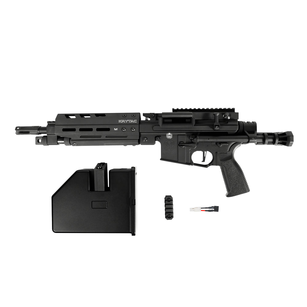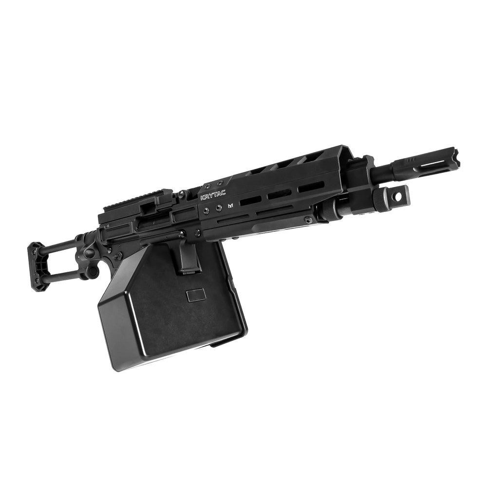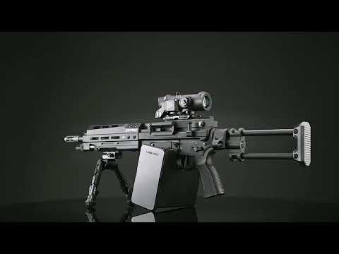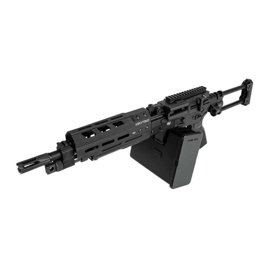 TRIDENT LMG di Krytac è un mix elegante e molto versatile. Il noto ricevitore inferiore M4 garantisce grande ergonomia e facile compatibilità dei componenti. Questa soluzione consente anche all’utente di utilizzare caricatori standard in stile M4, ma sappiamo tutti che il vero divertimento è con il suo caricatore da 3500 box. D’altra parte la tomaia unica in stile mitragliatrice è l’essenza di questa replica.