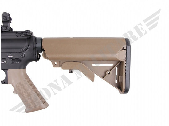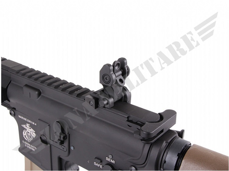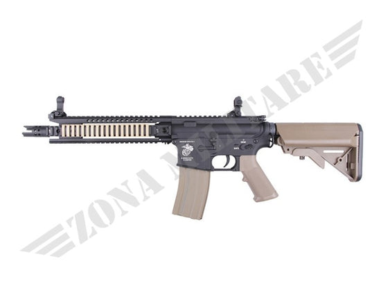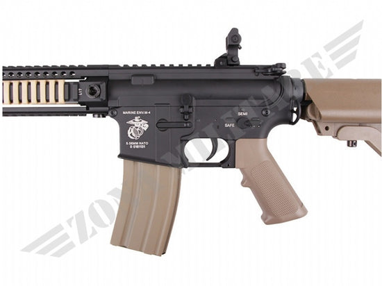 The Specna Arms brand SA-A01 carbine replica made predominantly of an homogenous alloy of zinc and aluminum with the use of steel elements in the most neuralgic points of the replica ( the screws, the pins and the tactical sling attachment points are made of steel ). The SF type stock which holds the battery and the pistol grip were made of polymer plastic. The replica’s body, the RIS rail set were a subject to the process of anodizing what guaranties a high level of protecting the replica against corrosion. The paintjob of the replica itself was made using the pulverization method after a previous sandblasting of the replica’s surface. This ensures the paint’s higher, than usually, durability against abrasion. The replica’s body beads the USMC markings.