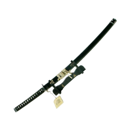 La spada ornamentale Katana "The Bride" è ispirata alla serie Kill Bill e presenta una lama incisa con un drago. Con una lunghezza totale di 1040mm e una lama di 680mm, questa spada è perfetta da esporre su un tavolo grazie al supporto in legno incluso. La copertura nera in legno e la tsuba in metallo completano questo pezzo d'arte.