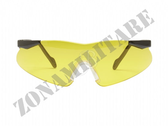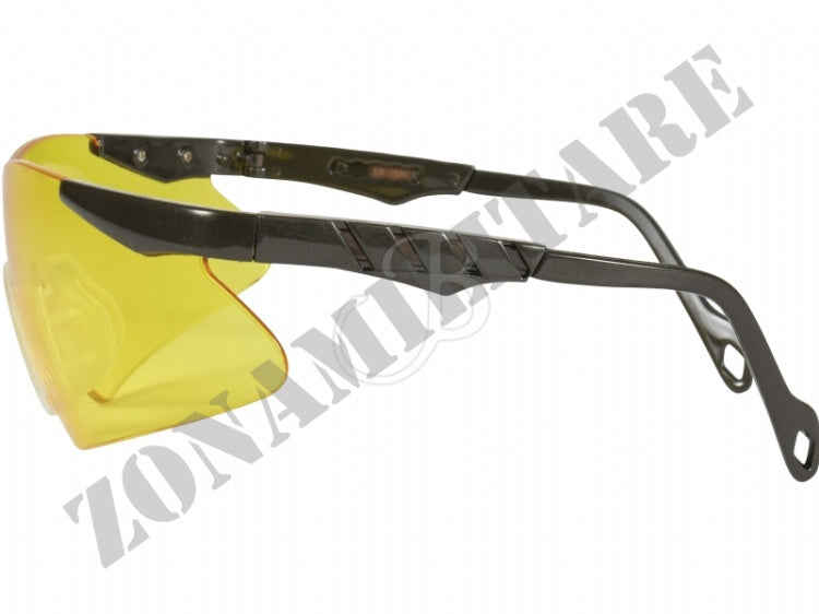 Occhiale da tiro con scocca scura e lente gialla per un'amplificazione della luminosità.