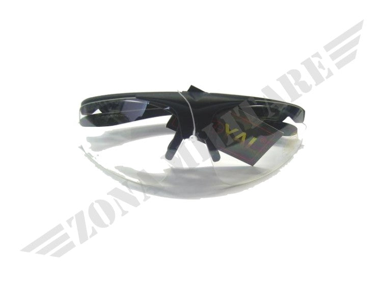 Occhiale protettivo con lente trasparente.