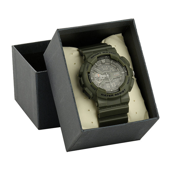 Questo modello multifunzione impermeabile mostra l'ora in un formato 12/24 su un moderno display LCD, con cronometro, sveglia, calendario automatico e retroilluminazione, estremamente utile nelle ore buie.