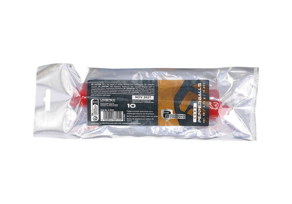 Le Pepperball calibro .68 sono progettate per fornire una potente difesa personale e deterrente a lungo raggio. Ogni palla combina la potenza balistica di un nucleo in acciaio con l'effetto inabilitante della polvere al peperoncino PAVA. Questa miscela crea una traiettoria stabile e il massimo impatto sul bersaglio, garantendo al contempo un'ottima diffusione del PAVA, causando temporaneo disagio oculare e respiratorio all'aggressore.