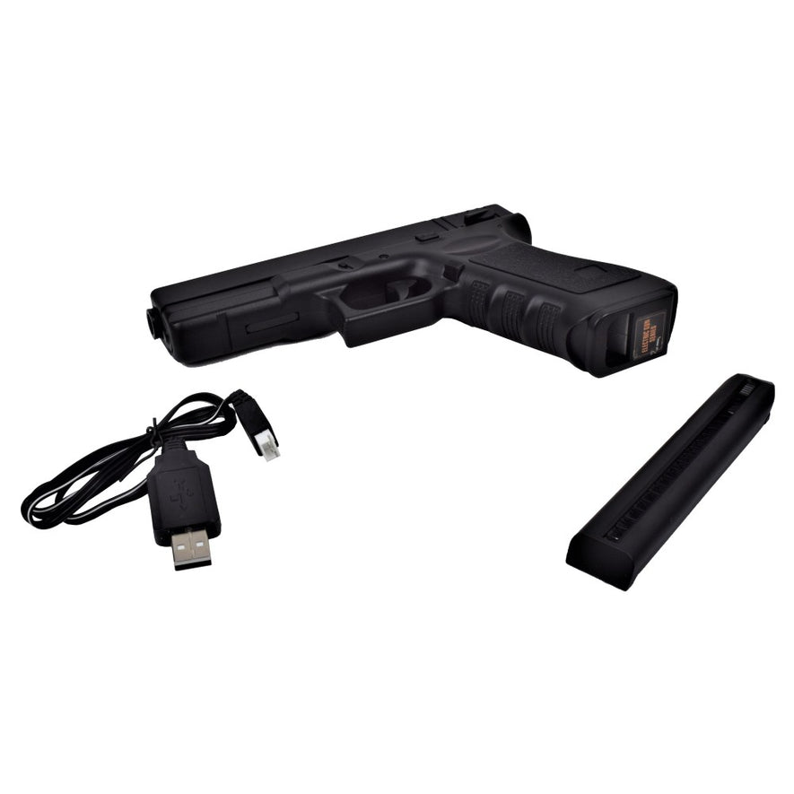 Pistola Elettrica C18 Cyma, versione con mosfet ed equipaggiata con una batteria LiPo. Realizzata in resistente polimero, è completa di sicura, colpo singolo/raffica, caricatore metallico da 28 colpi, slitta sotto canna, hop-up regolabile, gearbox v2, canna in ottone, lunghezza 190mm, peso 600g e una batteria da 7.4V x 500mah con cavo di ricarica USB e bb loader incluso. Raffica velocissima.