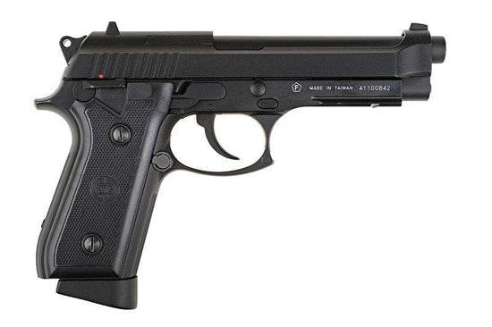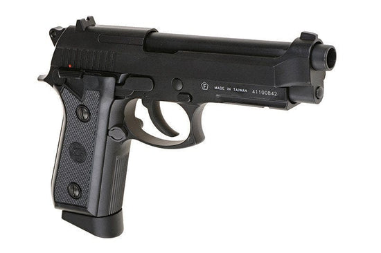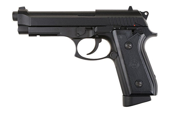 La pistola softair PT99 di KWC è una replica della famosa arma da fuoco italiana ed è composta da componenti in metallo e plastica. Pesa oltre 1 kg e vanta un impressionante sistema di contraccolpo con capacità di fuoco automatico. La serratura, il caricatore e la canna sono realizzati in metallo, mentre il telaio in plastica e la protezione del grilletto forniscono una sensazione realistica. Il selettore ad aletta bifacciale si trova nella parte posteriore della serratura e lo sblocco della serratura sul lato destro si attiva con il pollice. Ad ogni colpo, un dummy bloccaggio si ritrae e, dopo aver svuotato il caricatore, rimane nella posizione posteriore. Ciò fornisce un effetto "calcio", aggiungendo realismo e divertimento allo scatto. Il caricatore in metallo contiene sia il serbatoio del gas che 26 pallini.