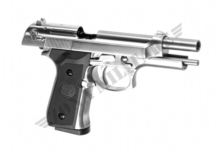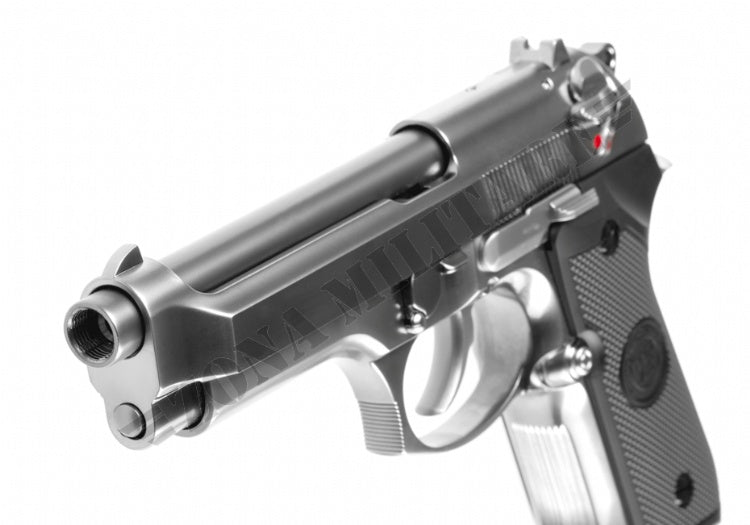 Pistola calibro 6 mm scarrellante completamente in metallo dotata di caricatore bifilare da 25 colpi con valvola di ultima generazione.