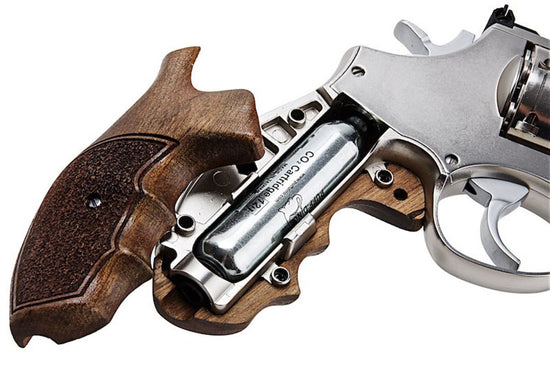 Ares decide di cambiare tutto questo una volta per tutte, aggiungendo un hop-up regolabile al suo modello base. L'ARES S&W 686 ha un hop-up in stile TDC e può essere regolato con una chiave a brugola, il che aumenta notevolmente la precisione. Sono finiti i giorni in cui si doveva ridurre la distanza dai nemici. Questo vantaggio surclassa la maggior parte dei revolver sul mercato, quindi se si gioca solo con revolver con questo modello, si sa di avere gittata e precisione dalla propria parte! Oltre ad avere un sistema Hop-Up adeguato, Ares ha mantenuto ciò che gli appassionati di revolver apprezzano dei revolver da softair, ovvero i bossoli rimovibili. Questi bossoli sono realizzati con attenzione ai dettagli, sebbene la punta sia in gomma, per mantenere la tenuta sul BB, subito sotto c'è una punta in rame e sotto ancora un bossolo in alluminio, il risultato è che ogni bossolo sembra un vero proiettile a punta cava, e per facilitare la ricarica, una clip a luna piena è inclusa con i bossoli, consentendo ricariche facili e veloci. Ma la ciliegina sulla torta dell'ARES S&W 686 è l'impugnatura in vero legno testurizzato, un materiale quasi sconosciuto per questa fascia di prezzo, per non parlare della testurizzazione, che offre una presa salda ma comoda.
