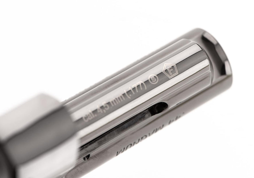 La versione da 6 mm alimentata a CO₂ di questa icona degli anni '60 è disponibile in metallo pieno con brunitura lucida e tre lunghezze di canna. Fedele all'originale, utilizza sei bossoli metallici color ottone, ciascuno caricato con un pallino. Sparato da un grilletto ad azione singola/doppia. La tacca di mira posteriore di tutte le versioni è regolabile in elevazione e derivazione. Inclusi 6 bossoli metallici.