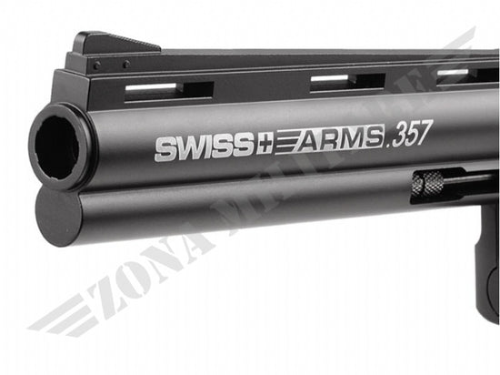 Bellissima replica della famosa 357 Magnum, revolver di licenza Swiss Arms, realizzato completamente in metallo e guancette in polimero contenenti l’alloggio della bombola di Co2. La versione a 6 pollici spicca per la notevole precisione di tiro.