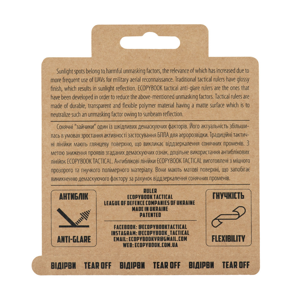 Il righello Ecopybook Tattico GTA NATO è progettato per l'uso tattico sul campo. Poiché i "coniglietti" sono uno dei fattori smascherabili sul campo di battaglia, l'importanza della cancelleria non riflettente è aumentata in modo significativo in condizioni di utilizzo attivo degli UAV da parte della ricognizione aerea nemica.