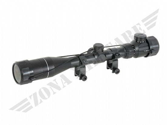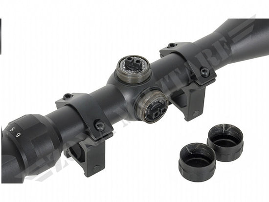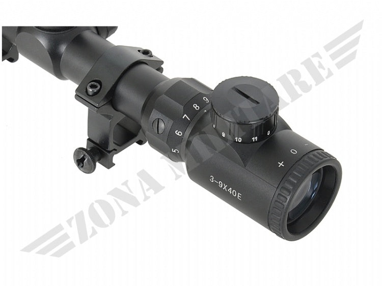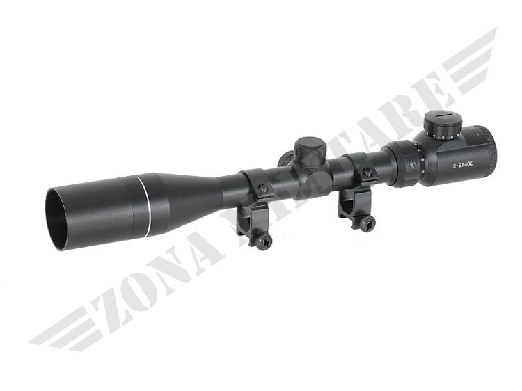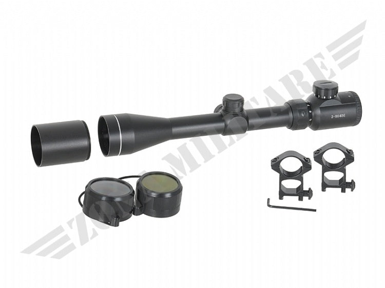 Il set include: cannocchiale 3-9x40E, copriobiettivo e anelli di montaggio alti per binario RIS da 22 mm.
