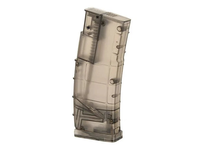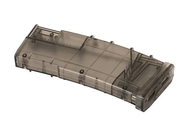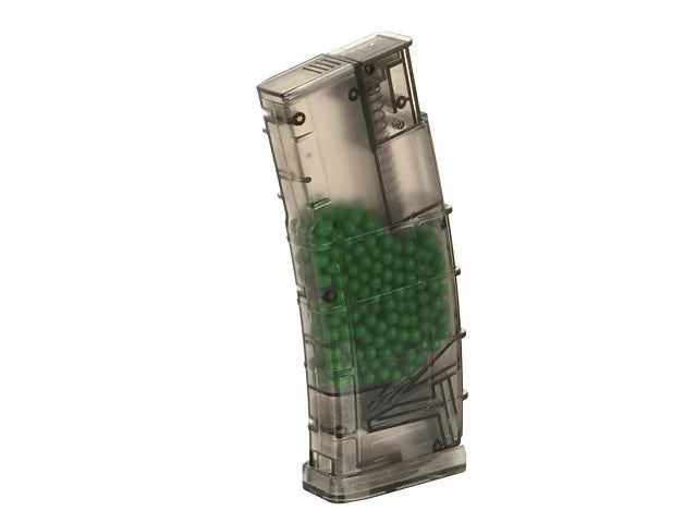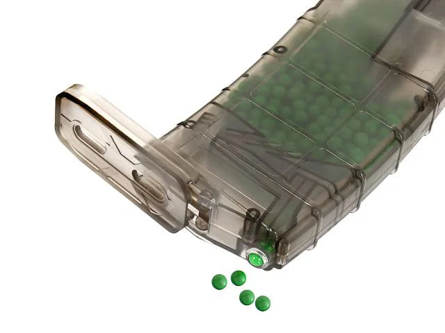 Caricatore rapido meccanico manuale per caricatori a molla a forma di moderno caricatore Magpul PMAG. Può contenere fino a 400 pallini, mentre il livello dei pallini interno può essere monitorato grazie alla plastica trasparente. Il caricatore è fissato all'imboccatura del caricatore e, premendo la leva mobile, le palline vengono spinte nel caricatore in dosi ripetute. Questo è il modo più semplice e veloce per riempire i serbatoi a pressione.