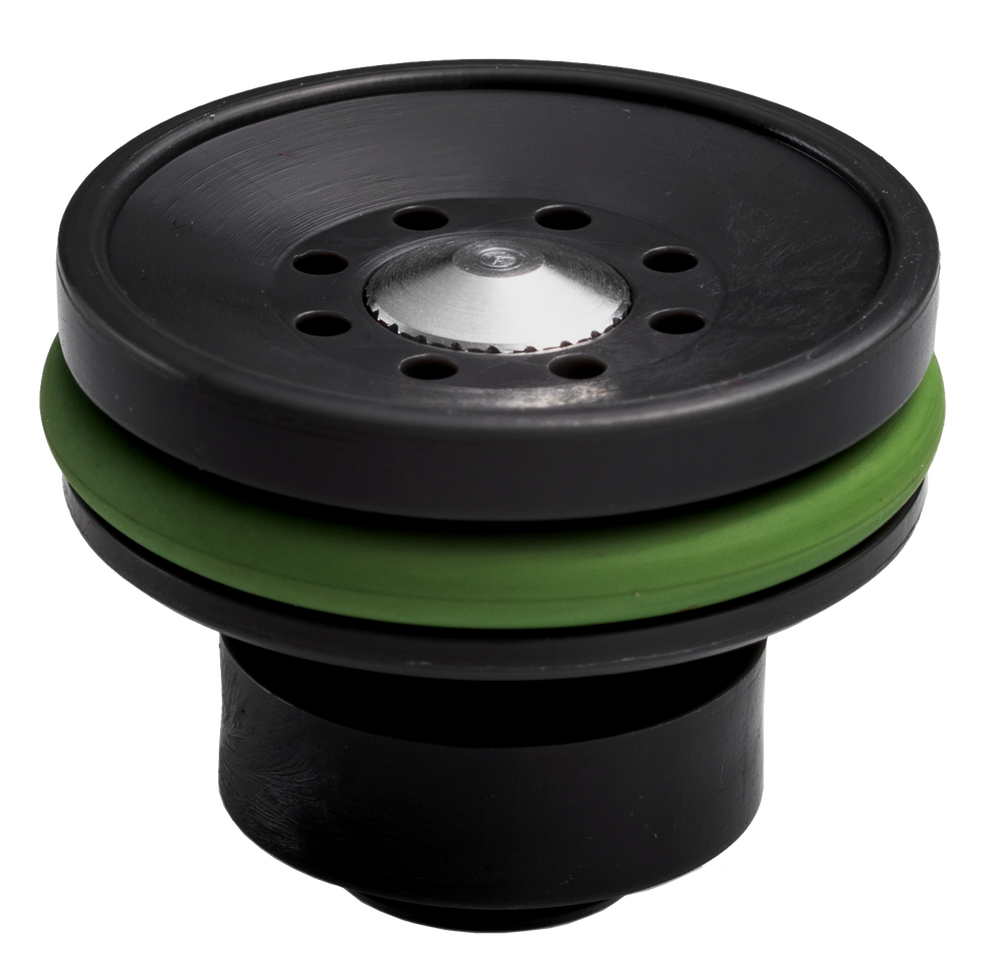 La particolare conformazione della parte battente (conica degradante verso il centro) assicura che i fori di ventilazione non vengano mai chiusi dalla gomma di battuta della testa cilindro, senza però lasciare troppa aria ferma tra testa cilindro e testa pistone.