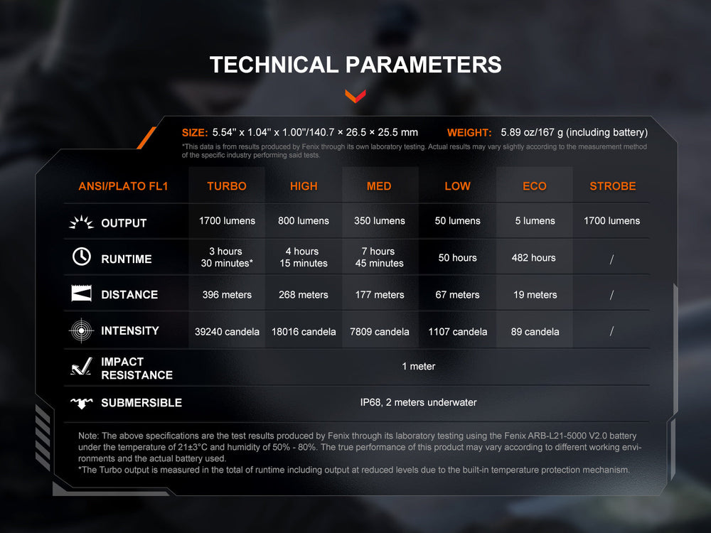 Incluso: batteria ricaricabile Fenix ARB-L21-5000 V2 da 5000 mAh 21700Compatibile: batterie Fenix ARB-Series formato 21700 o batterie formato 18650 (quando si utilizza l'adattatore per batteria ALF-18)